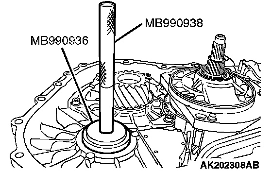 73. Use special tools MB990936 and MB990938 to tap the differential bearing outer race in the transaxle case.