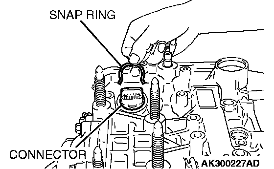 93. Insert the solenoid valve harness connector into the hole from the inside of the transaxle case so it is oriented as shown in the illustration. Then secure the snap ring to the connector groove.