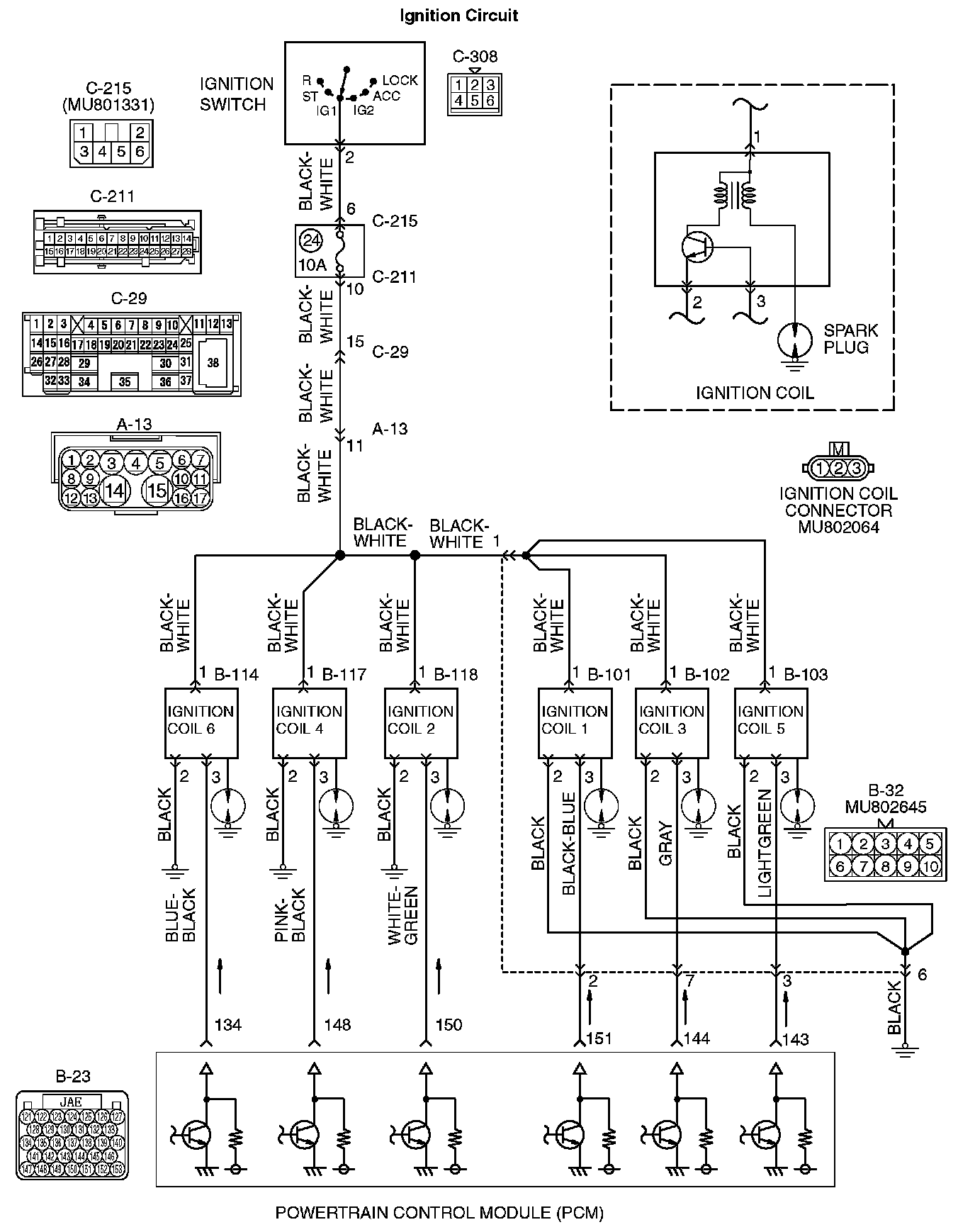 a. Check the harness wire between ignition coil connector B- 101 (terminal No. 3) and PCM connector B-23 (terminal No. 151) at ignition coil 1.