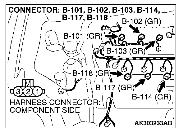 STEP 4. Check the circuit at ignition coil harness side connectors B-101, B-102, B-103, B-114, B-117, B-118.