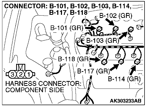 1. Disconnect the connectors B-101, B-102, B-103, B-114, B-117, B-118 and measure at the harness side.