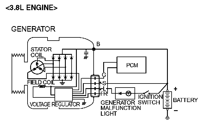 The generator output voltage rises as the field current increases and it falls as the field current decreases. When the battery positive voltage (generator S terminal voltage) reaches a regulated voltage of approximately 14.4 V, the field current is cut off. When the battery positive voltage drops below the regulated voltage, the voltage regulator regulates the output voltage to a constant level by controlling the field current.