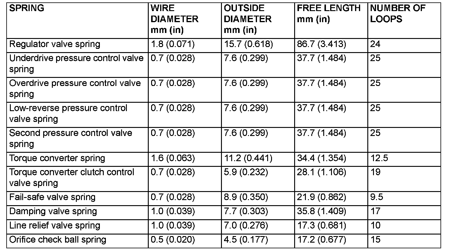 Valve Body Spring Identification Table