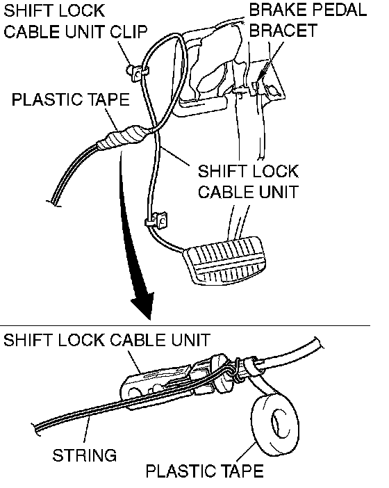4. Remove the string and the plastic tape from the shift lock cable unit, and then install the shift lock cable unit to the brake pedal bracket.