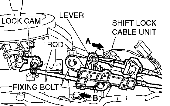 3. Install the rod of the shift lock cable unit to the lock cam, push the lever in direction A, push the shift lock cable unit in direction B and tighten the fixing bolt at the standard torque.