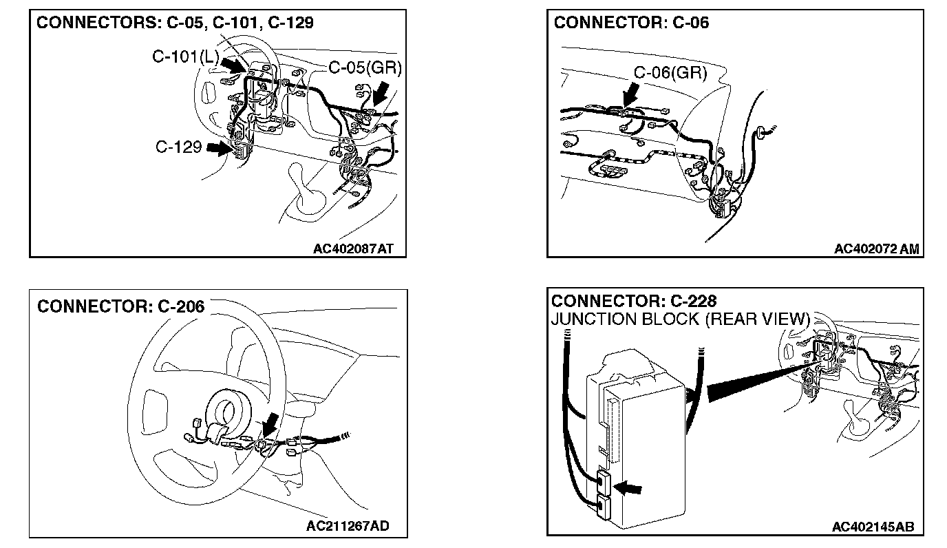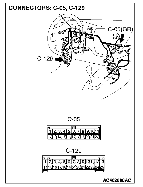 NOTE: Also check joint connector C-05 and intermediate connector C-129 for loose, corroded, or damaged terminals, or terminals pushed back in the connector. If joint connector C-05 or intermediate connectors C-129 is damaged, repair or replace the damaged components) as described in Harness Connector Inspection.