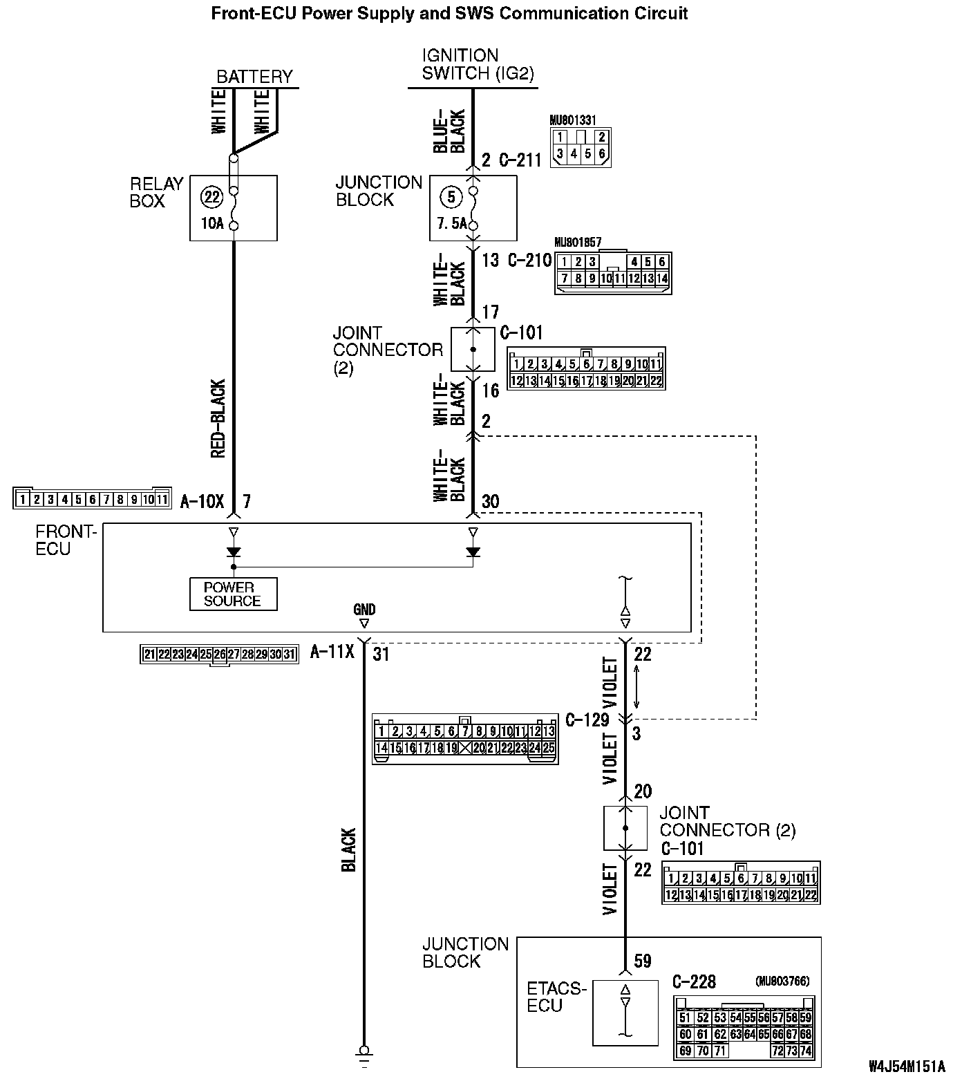 STEP 9. Check the wiring harness between front-ECU connector A-11X (terminal 22) and ETACS-ECU connector C-228 (terminal 59).