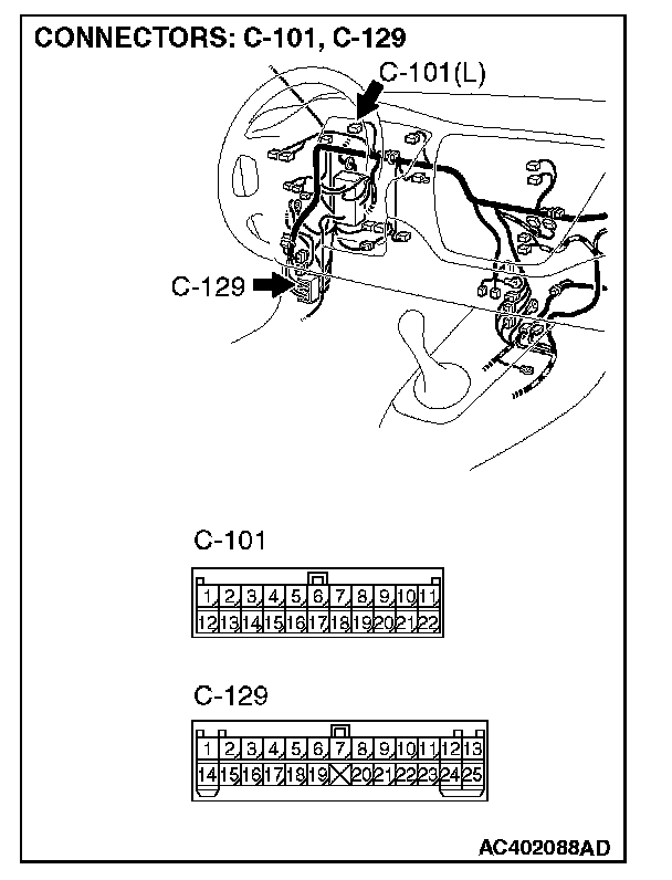 NOTE: Also check intermediate connector C-129 and joint connector C-101 for loose, corroded, or damaged terminals, or terminals pushed back in the connector. If intermediate connector C-129 or joint connector C-101 is damaged, repair or replace the damaged component(s) as described in Harness Connector Inspection.