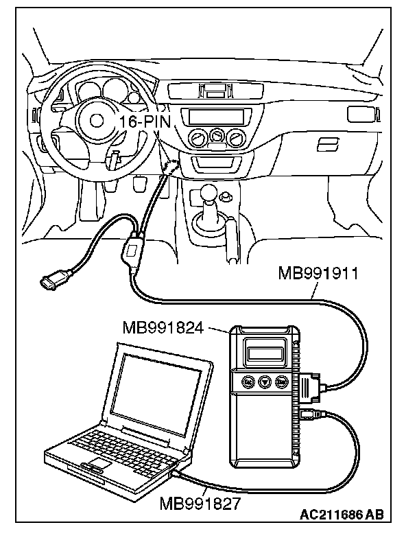 CAUTION: To prevent damage to scan tool MB991958, always turn the ignition switch to the "LOCK" (OFF) position before connecting or disconnecting scan tool MB991958.