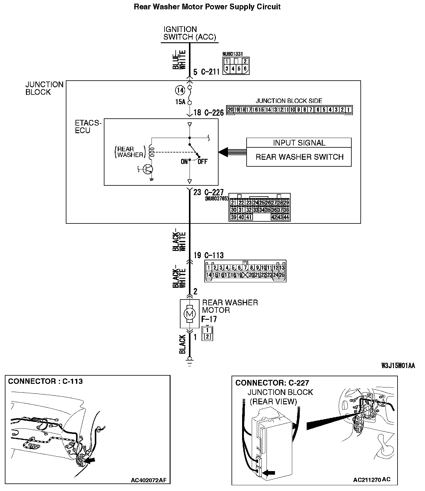STEP 8. Check the wiring harness between rear washer motor connector F-17 (terminal 2) and ETACS-ECU connector C-227 (terminal 23).