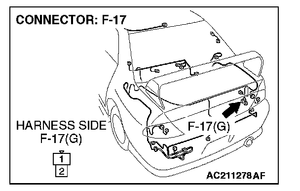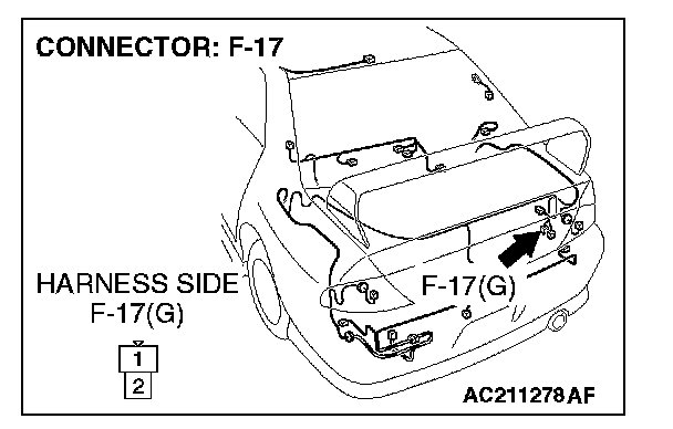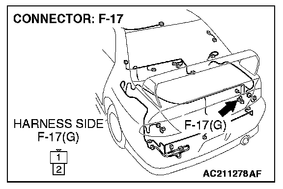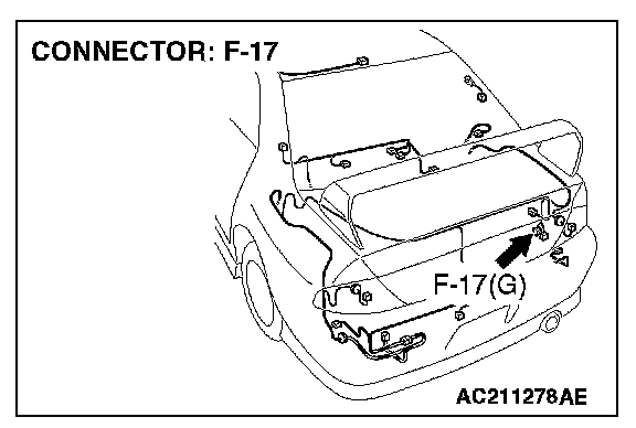 STEP 3. Check rear washer motor connector F-17 for loose, corroded or damaged terminals, or terminals pushed back in the connector.