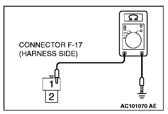 1. Disconnect rear washer motor connector F-17 and measure the resistance available at the wiring harness side of the connector.