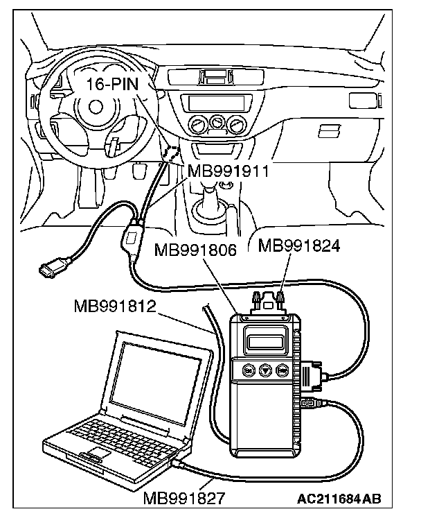 CAUTION: To prevent damage to scan tool MB991958, always turn the ignition switch to the "LOCK" (OFF) position before connecting or disconnecting scan tool MB991958. Connect special tool MB991911 before connecting special tool MB991812. Be sure to connect special tool MB991806 after turning on special tool MB991824.