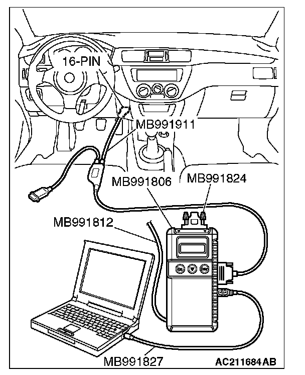 CAUTION: To prevent damage to scan tool MB991958, always turn the ignition switch to the "LOCK" (OFF) position before connecting or disconnecting scan tool MB991958. Connect special tool MB991911 before connecting special tool MB991812. Be sure to connect special tool MB991806 after turning on special tool MB991824. Open the driver's door before checking the input signals from the front door switch (LH).