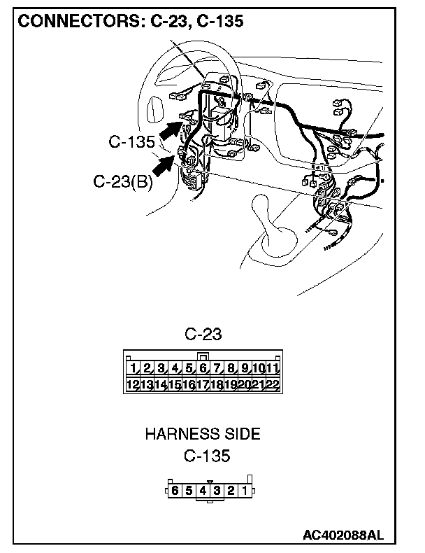 NOTE: Also check joint connector C-23 for loose, corroded, or damaged terminals, or terminals pushed back in the connector. If joint connector C-23 is damaged, repair or replace the damaged component(s) as described in Harness Connector Inspection.