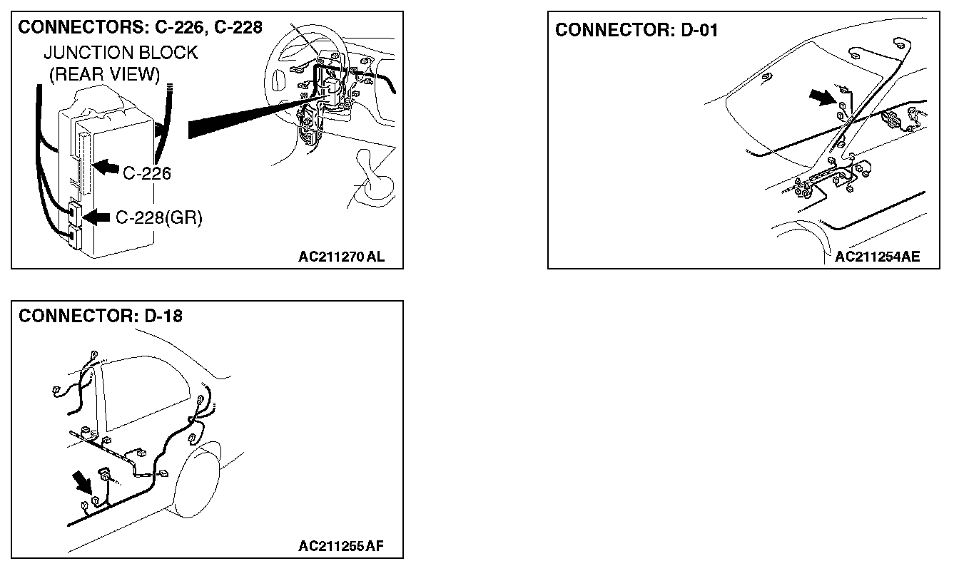STEP 6. Check the wiring harness between door switch (front: LH) connector D-18 (terminal 3) and ETACS-ECU connector C-226 (terminal 10).