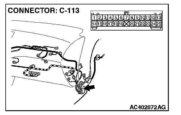 NOTE: Also check intermediate connector C-113 for loose, corroded, or damaged terminals, or terminals pushed back in the connector. If intermediate connectors C-113 is damaged, Repair or replace the damaged component(s) as described in Harness Connector Inspection.