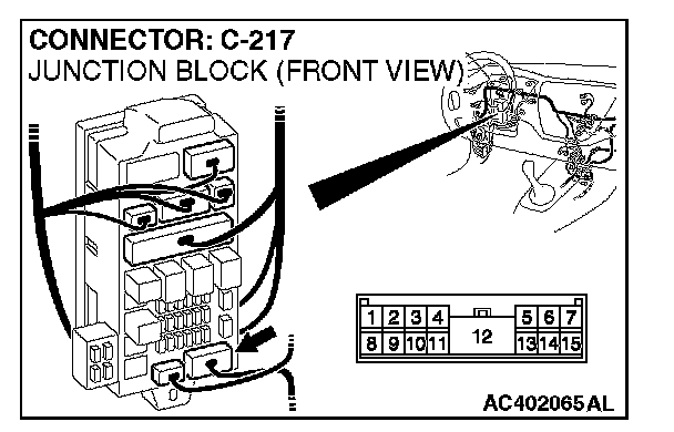 NOTE: Also check junction block connector C-217 for loose, corroded, or damaged terminals, or terminals pushed back in the connector. If junction block connector C-217 is damaged, Repair or replace the damaged component(s) as described in Harness Connector Inspection.