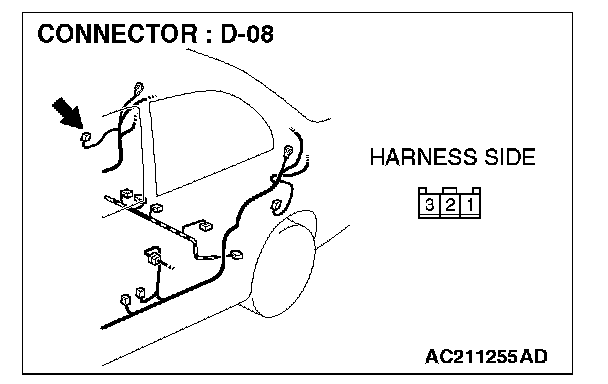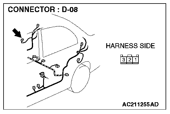 STEP 7. Check door switch (rear: RH) connector D-08 for loose, corroded or damaged terminals, or terminals pushed back in the connector.