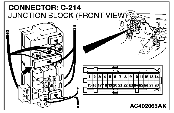NOTE: Also check intermediate connector C-113 and junction block connector C-214 for loose, corroded, or damaged terminals, or terminals pushed back in the connector. If intermediate connector C-113 or junction block connector C-214 is damaged, Repair or replace the damaged components) as described in Harness Connector Inspection.