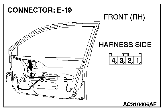 1. Disconnect power window sub switch connector E-19 and measure the resistance available at the wiring harness side of the connector.