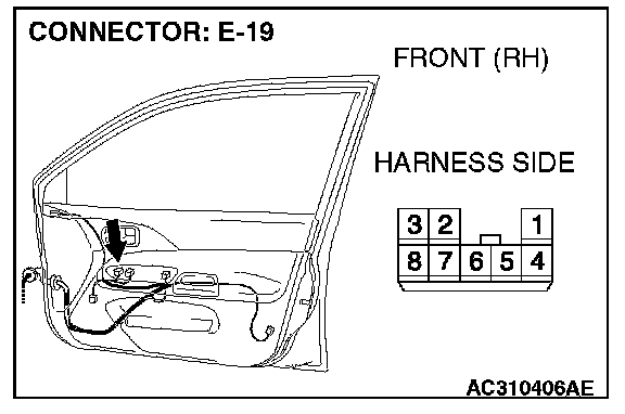 STEP 8. Check power window sub switch connector E-19 for loose, corroded or damaged terminals, or terminals pushed back in the connector.