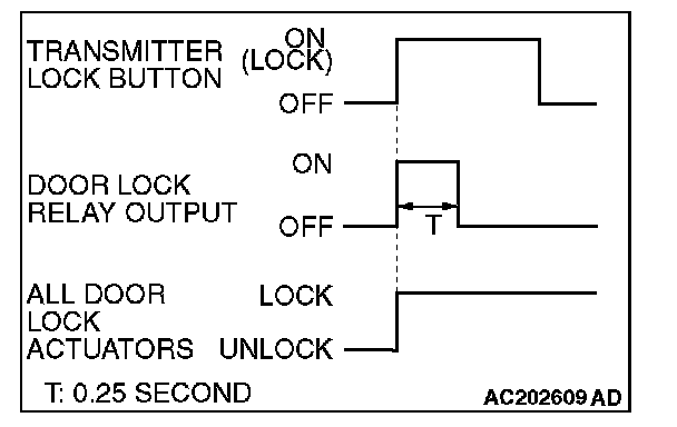 When the transmitter lock button is pressed, the ETACS-ECU energizes its door lock relay to operate all the door lock actuators for 0.25 second thus causing all doors to be locked.