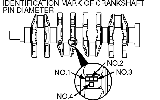 1. Measure the crankshaft pin diameter and confirm its classification from the following table. In the case of a crankshaft supplied as a service part, identification marks of its pins are stamped at the positions shown in the illustration.