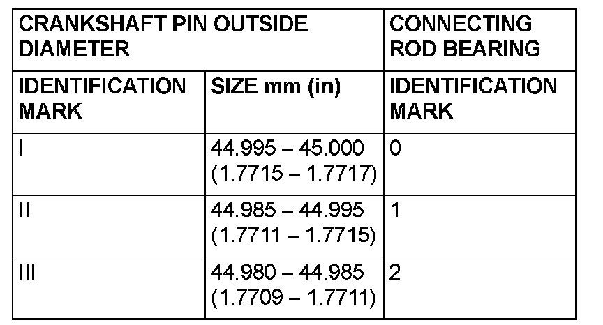 2. If the crankshaft pin outside diameter identification mark is "I," for example, select a bearing whose identification mark is "0."