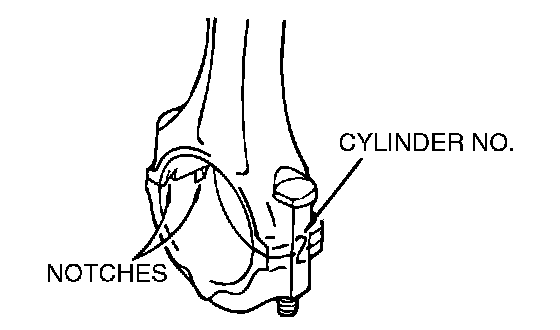 1. Verifying the mark made during disassembly, install the bearing cap to the connecting rod. If the connecting rod is new with no index mark, make sure that the bearing locking notches are on the same side as shown.