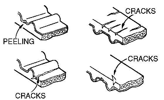Check the timing belt closely. Replace the belt with a new one if any of the following defects are evident: