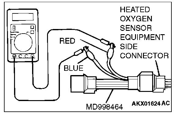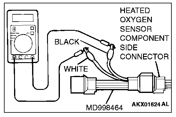 1. Disconnect the heated oxygen sensor connector and connect special tool MD998464 to the connector on the heated oxygen sensor side.