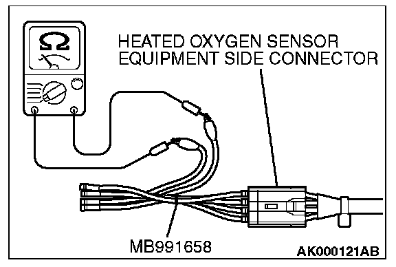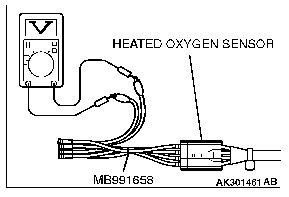 1. Disconnect the heated oxygen sensor connector and connect special tool MB991658 to the connector on the heated oxygen sensor side.