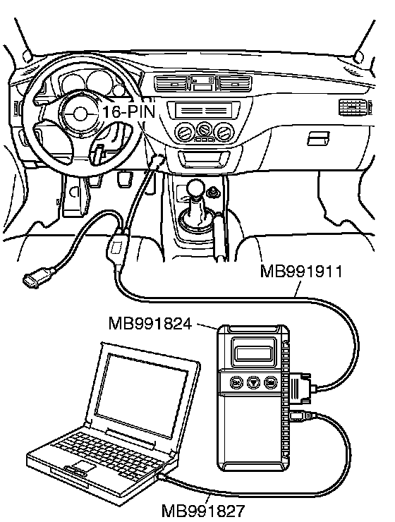 CAUTION: To prevent damage to scan tool MB991958, always turn the ignition switch to the LOCK (OFF) position before connecting or disconnecting scan tool MB991958.