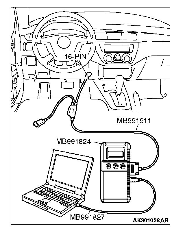 CAUTION: To prevent damage to scan tool MB991958, always turn the ignition switch to the "LOCK" (OFF) position before connecting or disconnecting scan tool MB991958.