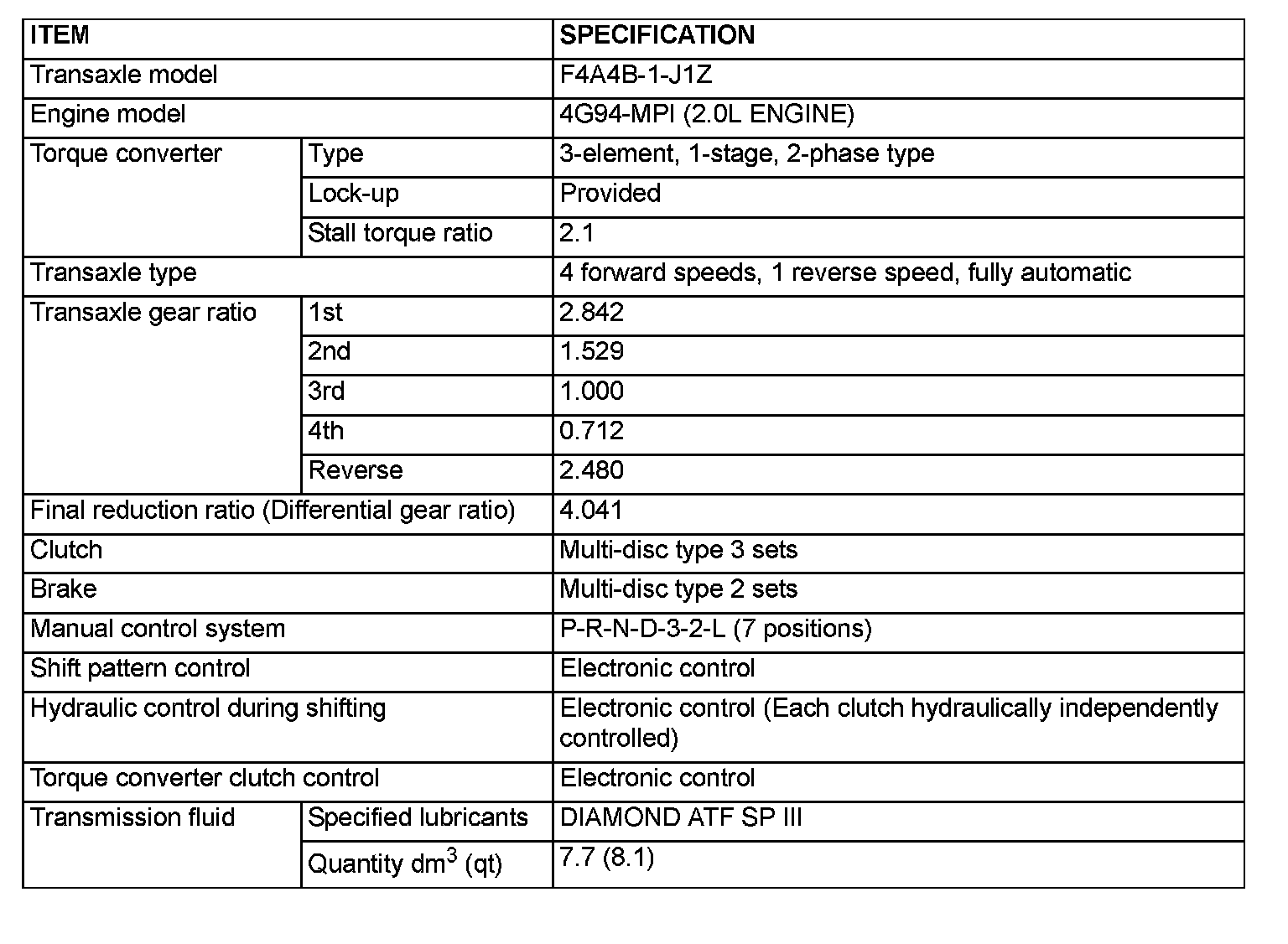 The transaxle is made up of the torque converter and gear train. A 3-element, 1-stage, 2-phase torque converter with built-in torque converter clutch is used. The gear train is made up of four sets of multi-disc clutches, two sets of multi-plate brakes, one set of one-way clutches and two sets of planetary gears. The planetary gears are made up of sun gears, carriers, pinion gears and annulus gears.