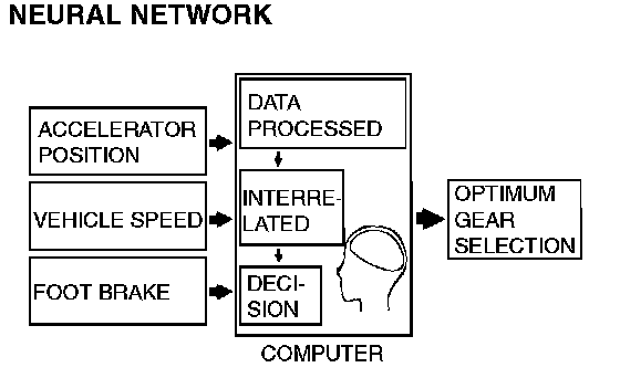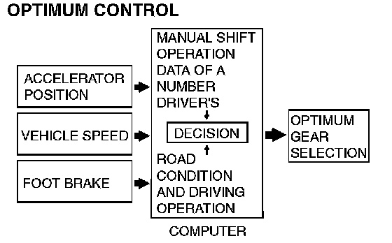 1. The shift patterns found satisfying by the typical driver for all ranges of driving are stored in the computer's memory. The computer uses this data to analyze road conditions and the driver's style of operation, and then outputs the optimal shift patterns stored in its memory to best match the conditions.