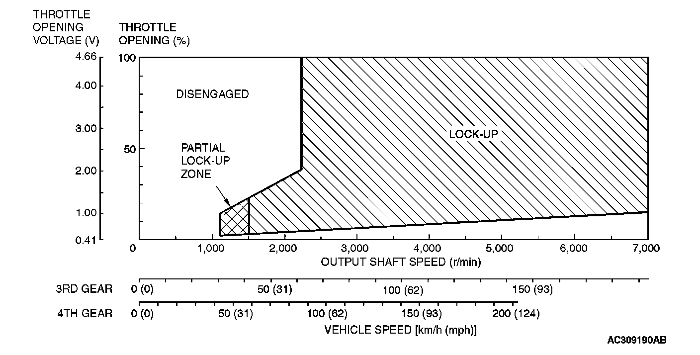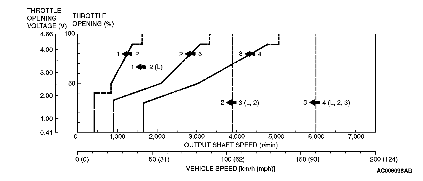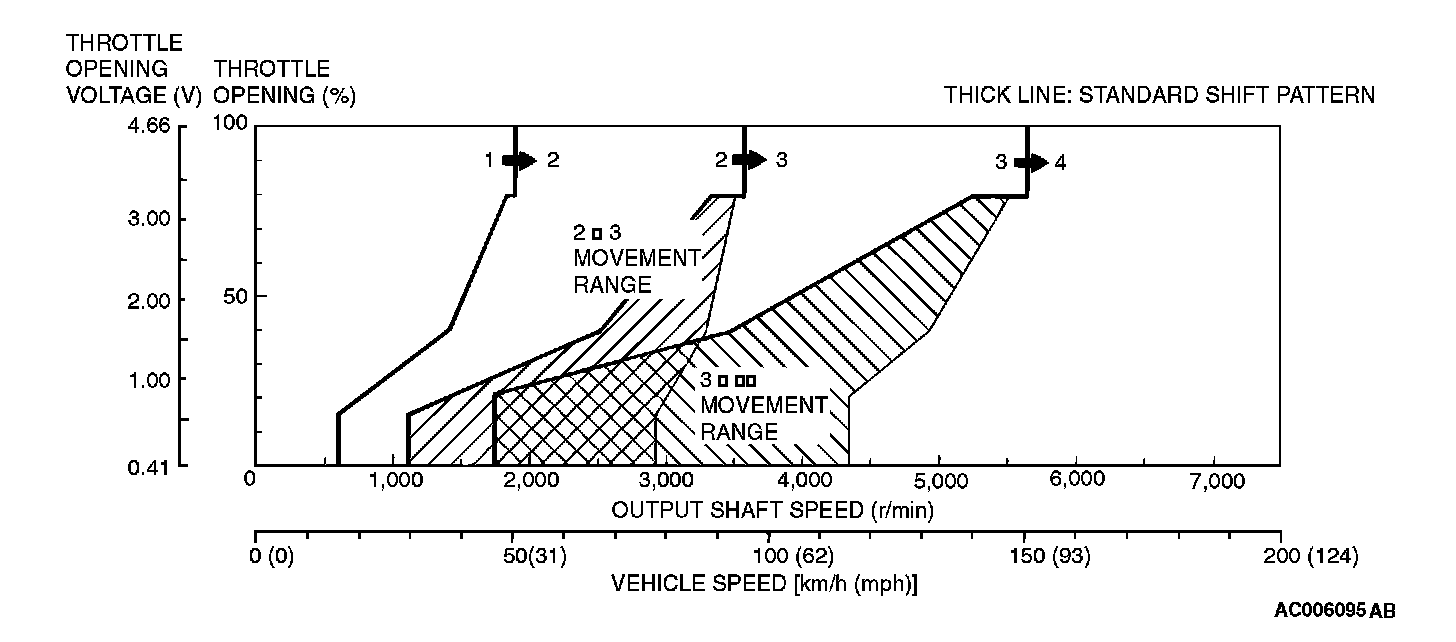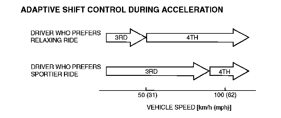 NOTE: Within 2 -to- 3 and 3 -to- 4 movement ranges, the PCM adjusts shift points according to the driving conditions by memorizing the accelerator pedal stroke and braking timing.