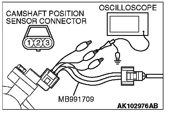 1. Disconnect the camshaft position sensor connector, and connect the test harness special tool (MB991709) between the separated connector. (All terminals should be connected.)