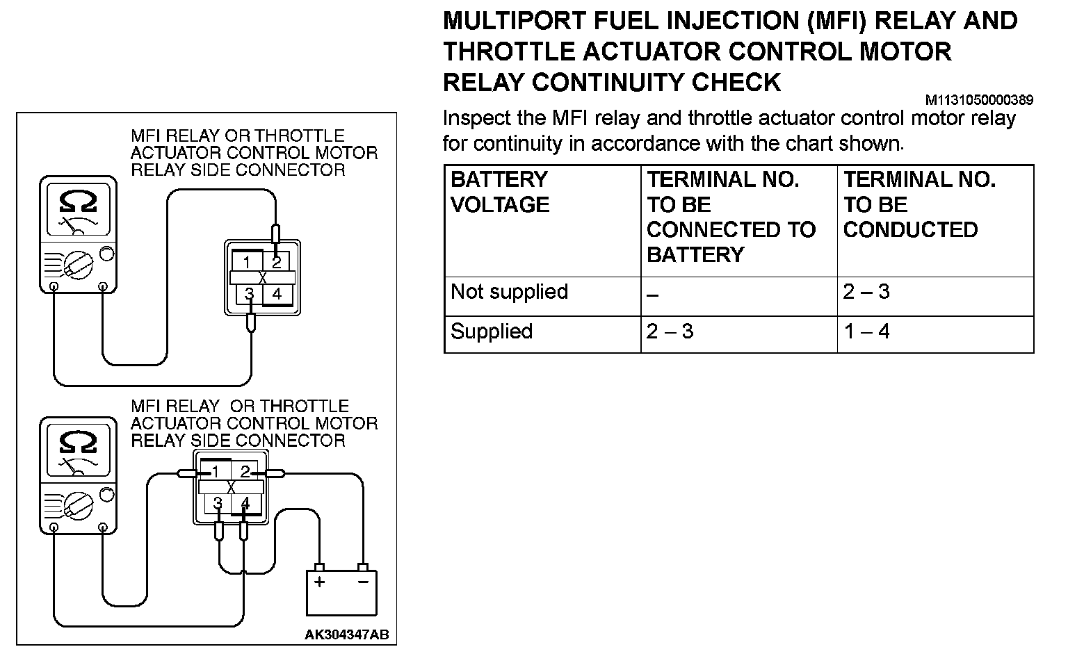 Multiport Fuel Injection (MFI) Relay And Throttle Actuator Control Motor Relay Continuity Check: