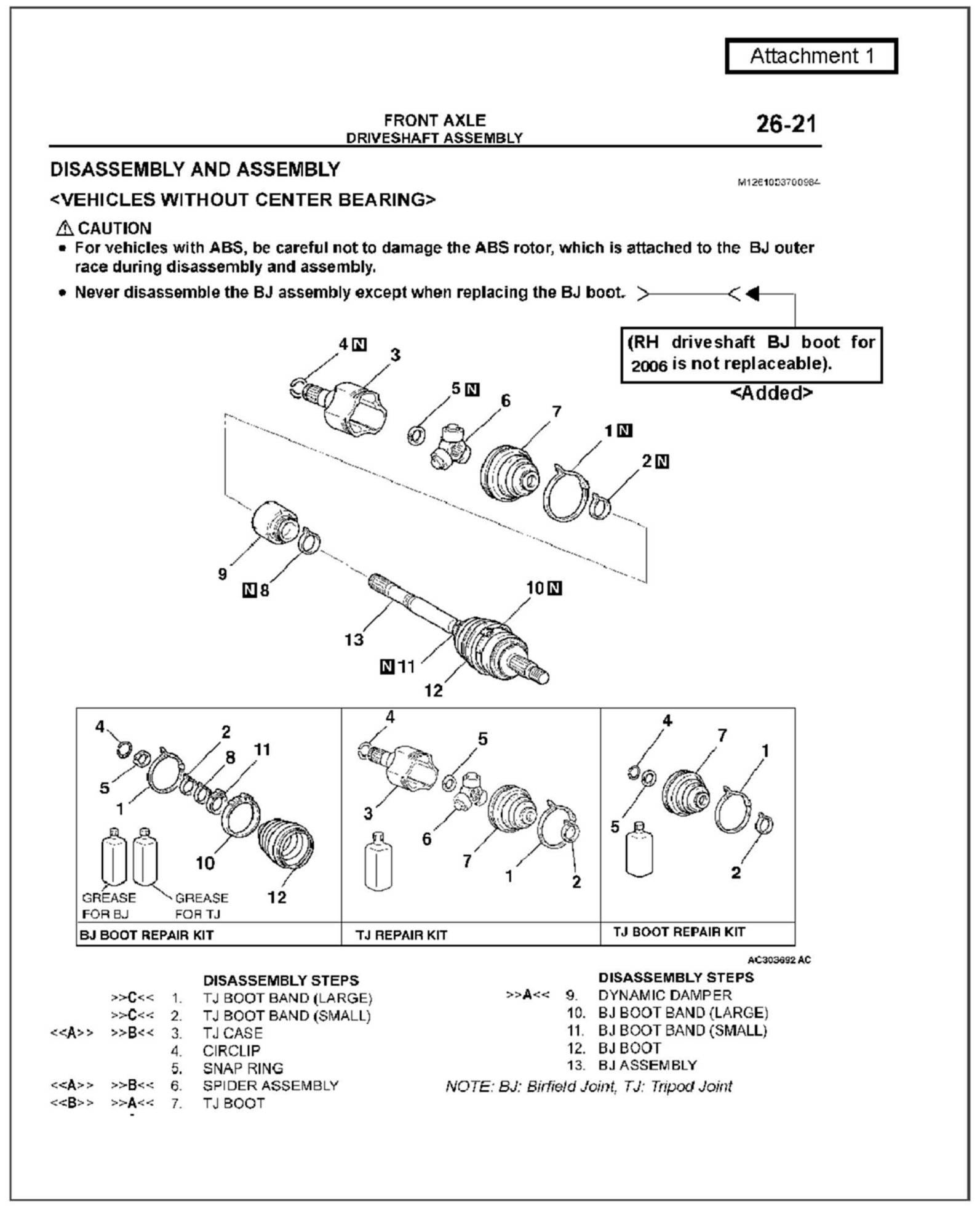 The cautionary instruction for disassembly of the BJ assembly for the front axle is corrected in the applicable Workshop Manual. This TSB contains the corrected description.