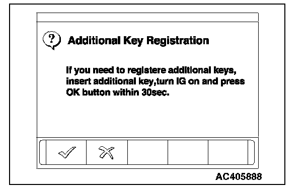 9. When the ignition key registration is finished, the additional key registration menu is displayed. To register the additional key, insert the key and turn the ignition switch to the "ON" position. Then, press the OK button. Press the CANCEL button to terminate the ignition key registration.
