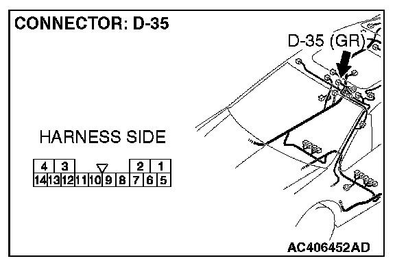 STEP 1. Check sunroof motor assembly connector D-35 for loose, corroded or damaged terminals, or terminals pushed back in the connector.