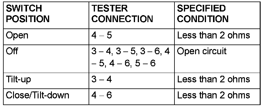 Check continuity when the sunroof switch is operated to "OPEN", "TILT UP" or "CLOSE/TILT DOWN" positions. Refer to Sunroof Assembly in Sunroof/Moonroof.