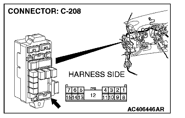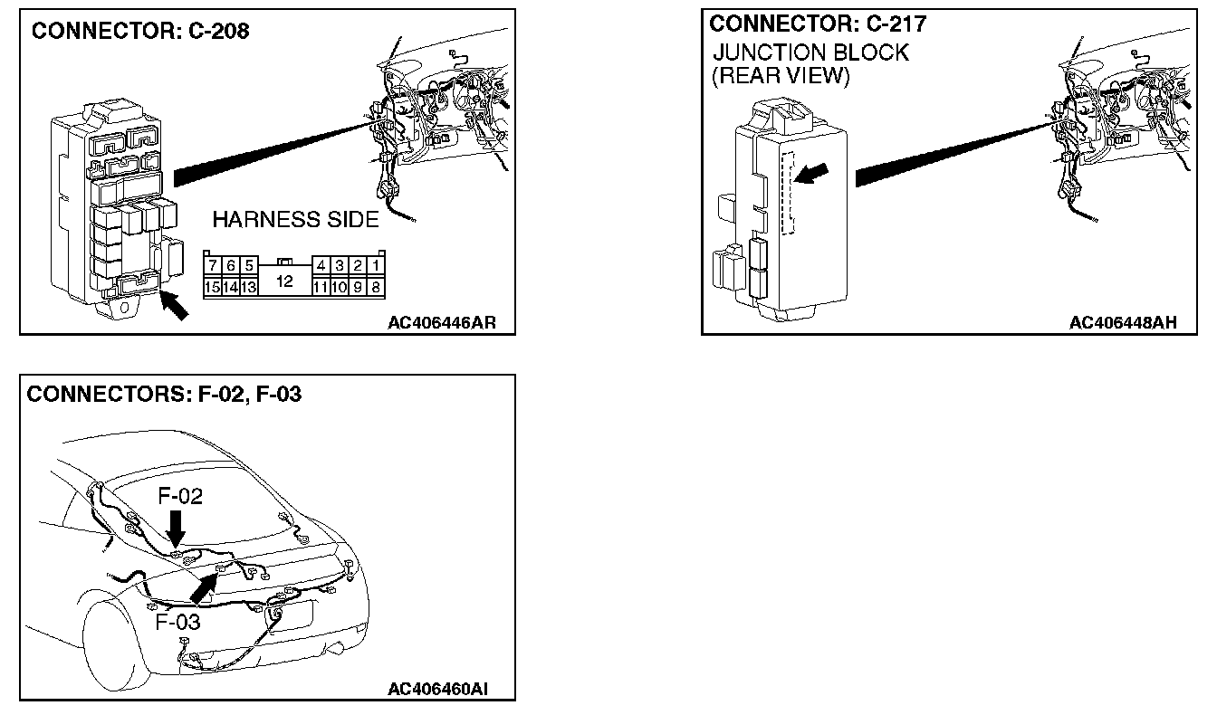 NOTE: Also check junction block connector C-208 and intermediate connector F-02 for loose, corroded, or damaged terminals, or terminals pushed back in the junction block connector C-208 or intermediate connector F-02 is damaged, repair or replace the damaged component(s) as described in Harness Connector Inspection.