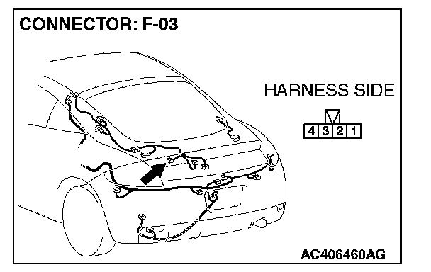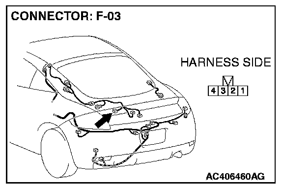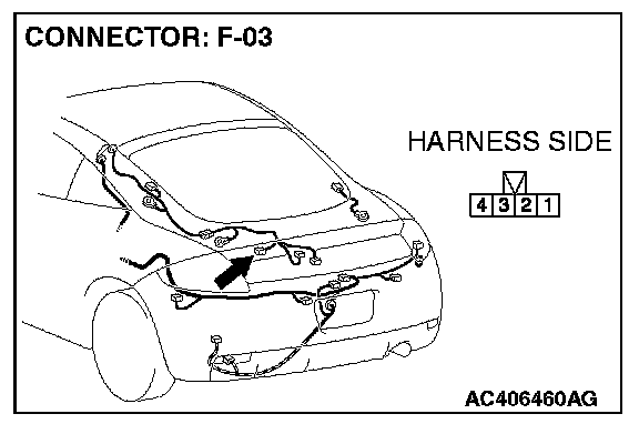 STEP 3. Check the rear wiper motor connector F-03 for loose, corroded or damaged terminals, or terminals pushed back in the connector.