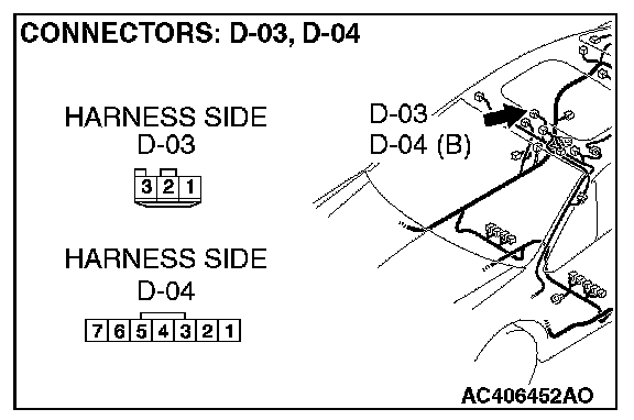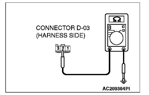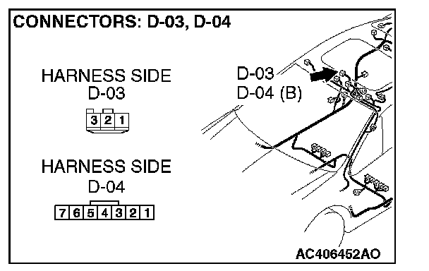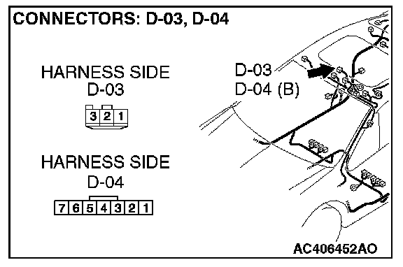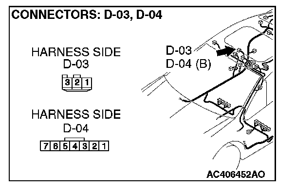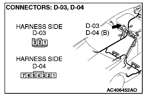 STEP 3. Check the wiring harness between front dome light connector D-03 (terminals 1 and 3)