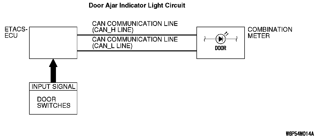 The combination meter receives the door switches signals from the ETACS-ECU, and then controls the door ajar indicator, based on these signals.