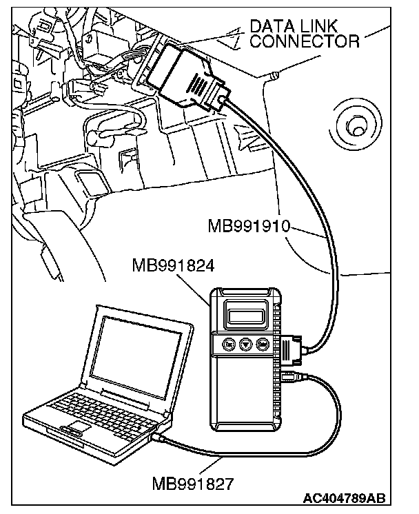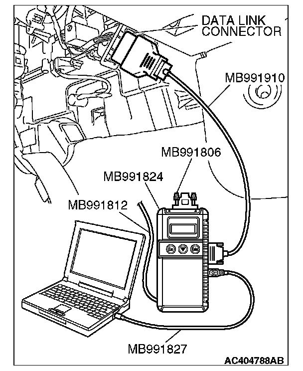 CAUTION: To prevent damage to scan tool MB991958, always turn the ignition switch to the "LOCK" (OFF) position before connecting or disconnecting scan tool MB991958.