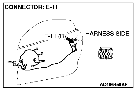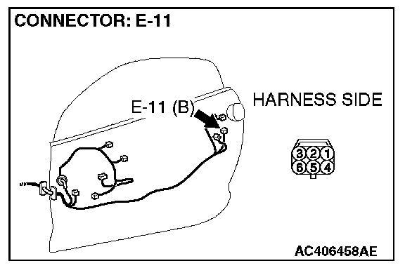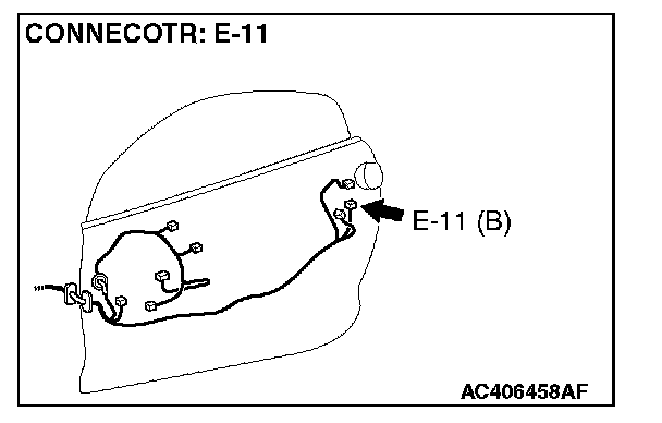 Disconnect door lock actuator (LH) connector E-11. Then check continuity between the terminals. Refer to Body - Door Handle and Latch.